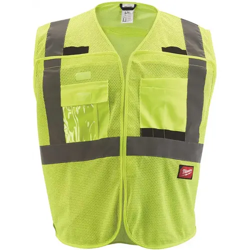 The Milwaukee 4XL/5XL Yellow ANSI Type R Class 2 Breakaway High Visibility Mesh Safety Vest is designed to keep users cooler and reduce odor with moisture-wicking and anti-microbial treated fabric. This breakaway safety vest features lightweight, breathable mesh, helping users stay cooler and comfortable in hot working conditions. The high visibility mesh safety vest has 9 pockets, including a clear ID holder and an internal pocket providing users with added storage. The vest features an external size adjustment providing users with a better fit and a durable pass-through slit for fall protection gear. The vest features 5 tearaway points located on the shoulders, sides and front of the vest that can breakaway if caught or snagged. Class 2 high visibility reflective vests are recommended when working in environments with traffic traveling under 50 MPH or around heavy machinery. This includes construction, road construction, traffic direction, utility crews and survey crews.