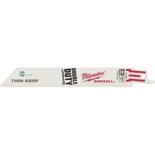 The Milwaukee 48-00-4186 6 in. x 24 TPI Thin Kerf metal-cutting blades with the Double Duty Upgrade feature a tooth form that is optimized for the longest life and increased speed. Tough Neck is engineered to protect against tang breakage and delivers the strongest SAWZALL blade tang on the market. Ice Hardened blades are cryogenically treated for up to 50% longer life. Maintaining a short profile and thin body, these blades are ideal for making fast, flexible cuts. The Milwaukee 48-00-4186 contains 5 blades.
