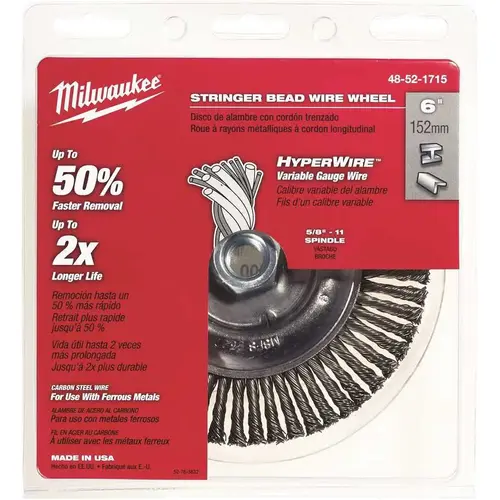 The Full Cable Twist Knot Wire Wheel is designed for general heavy duty cleaning of scale, surface oxidation, rubber flash, heavy burrs and weld splatter. Full Cable Twist Knot Wire Wheels are available in carbon and stainless steel. This Cable Knot Wire Wheel is designed for use with 7 or 9 in. Milwaukee and competitive Grinders with 5/8-11 threaded spindles. Made of stainless steel.