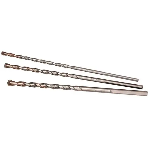 The Milwaukee 48-20-8850 3-Piece 3-Flat Secure-Grip Milwaukee Hammer-Drill Bit Set delivers superior quality in a range of the most useful bits on the jobsite. Milwaukee 3-Flat Secure-Grip Hammer-Drill Bits drill faster and last longer than others on the market. The 3-Flat Secure-Grip shank fits in all 1/2 in. 3-jaw hammer-drill chucks and maintains unyielding bit hold with heavy torsional loads. Designed especially for conical anchor, concrete screw, nail-in and hollow wall anchor applications, the bits provide superior performance through reinforced flute geometry and the carbide tip design. Milwaukee offers a complete range of 3-Flat Secure-Grip Hammer-Drill Bits in diameters from 1/8 in. to 1 in. with lengths up to 18 in. The 3-Piece Kit includes hammer-drill bits sized 1/4 in. x 4 in. x 6 in., 3/16 in. x 4 in. x 6 in. and 5/32 in. x 4 in. x 6 in.