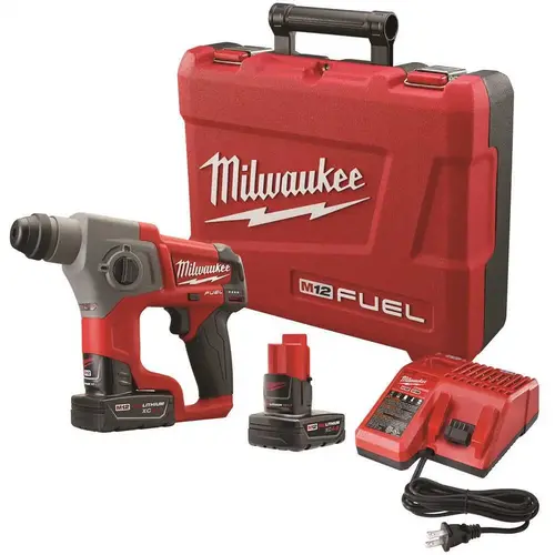 The MILWAUKEE M12 FUEL 5/8 in. SDS Plus Rotary Hammer Kit provides up to 75% faster drilling, up to 70% less vibration and up to 2X more runtime and the largest SDS Plus bit capacity in its class. Milwaukee has combined its exclusive POWERSTATE Brushless Motor, REDLITHIUM Battery Pack and REDLINK PLUS Intelligenceto deliver users optimized performance, overload protection and superior pack construction. The electro-pneumatic design allows for drilling of up to 5/8 in. holes in concrete and masonry. At only 10 in. long and 3.9 lbs., this tool provides performance and runtime that is comparable to a much larger tool, at a fraction of the size and weight. The rotary hammer also features 2-mode operation; rotary hammer and rotation only for maximum versatility, regardless of application or orientation. In addition to the rotary hammer, this kit includes two M12 REDLITHIUM XC 4.0 Extended-Capacity Battery Packs, one M12 Charger and a plastic carrying case.