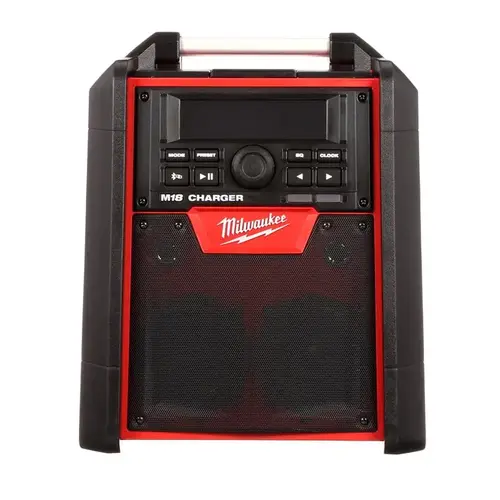The Milwaukee M18 jobsite radio/charger is the first charging radio to bring the power of Bluetooth to the jobsite, while delivering the industry's best reception and sound. The most advanced radio of its kind, the M18 jobsite radio/charger features a Bluetooth receiver so you can stream rich, full sound wirelessly from over 100 ft away. Its unique battery charger allows you to charge any M18 battery without sacrificing reception or sound quality. For added versatility, a high-power USB port allows you to charge most portable electronic devices over 50% faster than any competitor. The M18 radio/charger's lightweight, high-strength design includes a reinforced roll cage for protection from weather and abusive jobsite conditions. The radio/charger also offers the industry's largest on-board, weather-sealed storage compartment to protect your small belongings and smart phones. A 16 in auxiliary input cord and 2 AAA batteries are included.