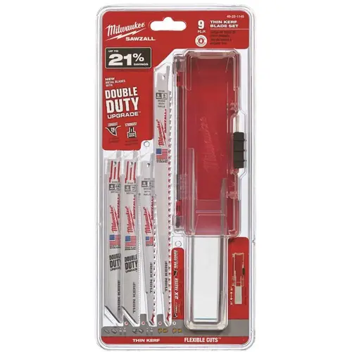 Outfit your Milwaukee Sawzall with these Sawzall Reciprocating Saw Blades to cut through a variety of material, including wood, plastic and metal. This set includes nine bi-metal blades fashioned with precision-formed cobalt teeth that cut fast and stay sharp. A thin kerf on each blade results in less material removal and effortless operation of your reciprocating saw.