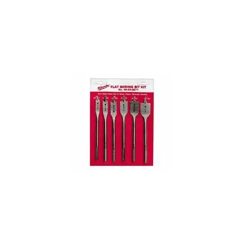 Includes: (1) 3/8 in (1) 1/2 in (1) 5/8 in (1) 3/4 in (1) 7/8 in (1) 1 in Flat Boring Bits