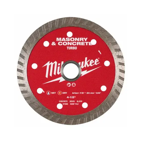 Our turbo masonry and concrete diamond blades offer less chipping and increased control. The turbo rim design provides a cleaner finish in materials like concrete, brick, block, pavers and roof tile. Designed with high-quality diamonds, these blades provide up to 2X longer life in concrete. The vented steel core keeps the blade cool and ensures consistent cuts throughout the life of the blade. For use wet and dry.