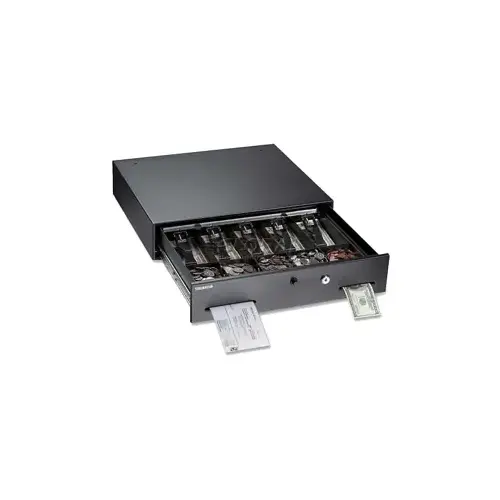 Ideal for retail stores, banks, currency exchanges, and small businesses, the STEELMASTER Touch Button Cash Drawer automatically springs open when the release button is pushed and the key is unlocked. The Touch Button Cash drawer also features extra wide cash trays to accommodate foreign currency, spring-loaded bill weights, five round bottom coin trays for easy scooping, two media slots for safe storage of large bills, checks, and credit card receipts and the high quality, heavy gauge steel construction that you've come to expect from STEELMASTER. The scratch and chip-resistant finish will stand up to everyday use. Flat Key Locking Cover (Keyed Alike). Under-counter mounting brackets, two drawer keys, and two cover keys included. Replacement cash trays available.