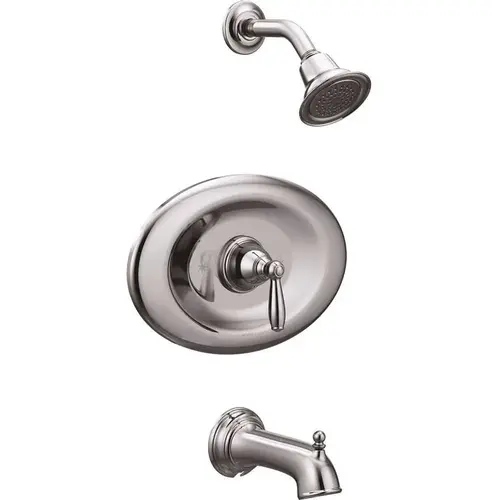 With intricate architectural features that transcend time, Brantford faucets and accessories give any bath a polished, traditional look. Classic lever handles, a tapered spout and globe finial give this collection universal appeal. This tub shower was built to last by MOEN.