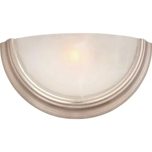 A wall sconce fixture with a brushed nickel finish. The shade is an alabaster glass half dome. Bulbs and mounting hardware are included.