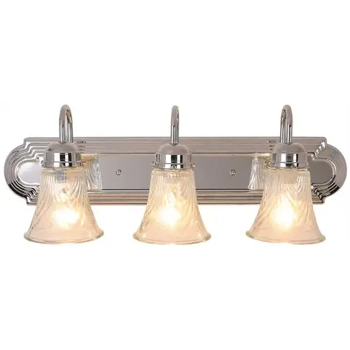 A sleek chrome finish and bright multi-light design characterize this 3-Light Interior Wall Fixture. The clear textured glass extends on curved arms from a long oval back plate, which features a tiered edge. Install this wall fixture up or down depending on what suits your space. No matter where or how you place it, you will enjoy this fixture's bright light and transitional style. The fixture is 8-1/2 in. H x 24 in. W and extends 7-7/8 in. from the wall. It uses 3 medium-base light bulbs, 60-Watt maximum (not included). This interior fixture is UL listed for safety. It is backed by a1-year manufacturer's warranty against defects in materials and workmanship.