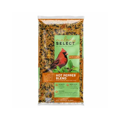 Melody Select hot pepper wild bird food is a spicy blend of nutritious ingredients carefully crafted to attract colorful songbirds but send squirrels running far away. Bring the heat to your backyard with this premium bird feed blend featuring a generous amount of sunflower hearts, high-energy peanuts, safflower seed and a sprinkling of fiery hot pepper.