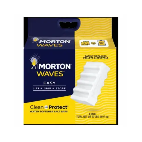 Morton Waves Clean and Protect water softener salt bars are easy to lift, open and fill, thanks to its patented design and new package, including a sturdy plastic handle for more comfortable carrying and an easy-tear opening. Made with the same Clean and Protect formula you know, these bars are formulated to extend the life of appliances, along with all the soft water benefits you expect in a new and convenient shape.