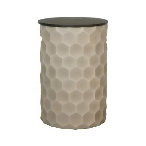 Four Seasons, LP Gas Outdoor Fire Pit Column with Honeycomb Pattern Stone Look. Dimensions are 11.8" D x 17.7" H. Light by match. Includes Magnesium oxide base, Stainless Steel burner & plate, cover & glass beads.