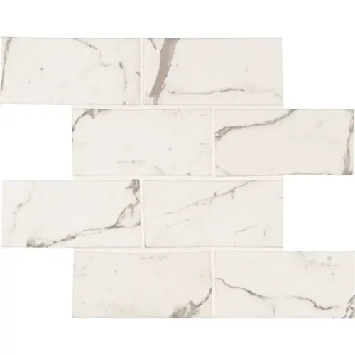 Enhance your home interior with this MSI Statuario Celano Glass Mesh-Mounted Mosaic Tile. Great for kitchen and bathroom backsplashes, floors and walls, it features a Grade-1 rating and mesh backing for easy installation. It offers frost resistance for indoor, outdoor, commercial and residential use. The glass-blend mosaic look with gray tones creates charm in any space.