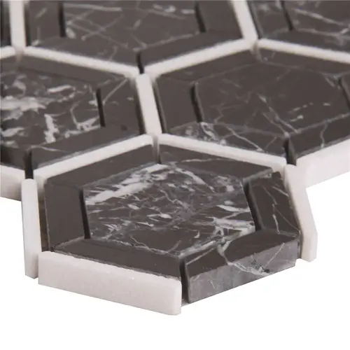 Add a retro yet contemporary flair to your home with these MSI Hexagono Nero Mosaic Tiles. These tiles are GREENGUARD Indoor Air Quality Certified and come mounted on mesh-backed sheets for a simplified installation and professional finish. Add these tiles to walls, backsplash, shower surrounds or anywhere in your home that needs an update. Featuring a black marble background and layers of interlocking white marble hexagons, it's a throw-back to retro styling that leaves a bold impression. The polished finish is sophisticated and they are crafted of natural stone.