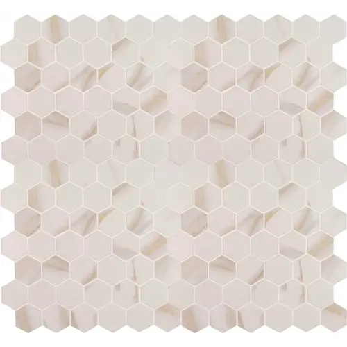 Whether you need to update your outdoor terrace or kitchen backsplash, these MSI Calacatta Hexagon Porcelain Mesh-Mounted Mosaic Floor and Wall Tiles are the perfect choice and add a striking accent to your home. These tiles can be used as medium-duty flooring and they are slip-resistant wherever you place them. They come in in 1 sq. ft. sections for ease of installation and offer a lovely marble look with stunning whites and warm beige veining that delivers a world class look. This tile features 2 in. hexagon chips on a 12 in. x 12 in. mesh-mounted mosaic sheet with a smooth finish and can be used for whole floors or wall sections or trimmed to fit your desired need.