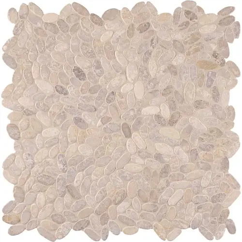 MSI's Sliced Pebble Ash Mosaic is a beautiful blend of cream, beige and light brown hues, offered in an enchanting mix of pebble sizes. Creating a tranquil ambiance is easy with these warm neutrals. Durable and water-resistant, these natural marble pebbles are suitable for high traffic areas. Use them on walls, floors and countertops - in both homes and commercial properties. In the bath, they add texture and warmth underfoot for a spa-like appeal and they're an especially attractive vanity accent tile. Note: Please inspect all tiles before installation, as natural stone products inherently lack uniformity and are subject to variation in color, shade, finish, etc., so it is recommended to blend tiles from different boxes when installing. Natural stones may be characterized by dry seams and pits that are often filled. The filling can work its way out and it may be necessary to refill these voids as part of a normal maintenance procedure. All natural stone products should be sealed with a penetrating sealer.