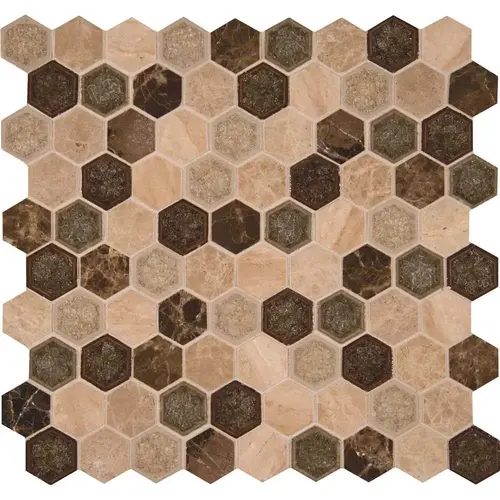 Update your contemporary decor with the affordable elegance of the MSI Kensington Hexagon Glass and Stone Blend Mosaic Wall Tile. Crackle glass and natural marbles in a hexagonal shape give it a jewelry-like appearance. With multicolored tones of glass blended with beige and brown marble, this tile is ideal for interior and exterior walls.