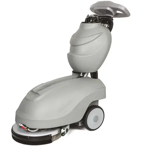 Namco 14" Battery Scrubber. Rugged Two-Piece Roto Molded Polyethylene. Powerful 1.8 HP 3 stage vacuum motor provides 135 water lift and 95 CFM of airflow. Features a 130 PSI diaphragm pump with bypass providing variable flow up to 1.1 gpm. The variable flow rate coupled with an adjustable vacuum shoe and brush pressure allow it to be used for both interim maintenance and restorative cleaning. Efficient forward motion allows upwards of 3000 sq. ft./ hour to be cleaned three times the rate of pull back self-contained units. Other key features include, easy access removeable spray bar with twist off jets and push forward design. The lock down vacuum shoe ensures consistent pressure on the carpet always. The large 12-gallon tanks enable it to tackle even the biggest commercial jobs. Lightweight and easy to transport with the upper and lower tanks detaching into two separate units. Accepts all optional accessories including the optional heater. Mfg #11105