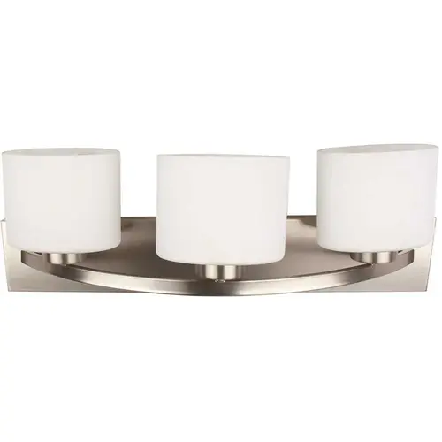 The 3-Light Brushed Nickel Vanity has a sleek design with beautifully constructed clean lines. Perfect for complementing many decor styles, this vanity features a refreshing brushed nickel finish and etched opal glass shades for bright and warm illumination. Perfect for giving your bath or powder room an elegant upgrade. Durable steel construction with plated finish gives a clean look Uses three-10-Watt medium based A19 LED bulb(Not included) or CFL equivalent Compatible.