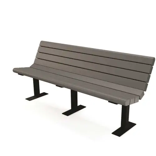 The Jameson Recycled Plastic Bench is made with eight 3 in. x 4 in. tri-blend recycled HDPE Resin wood slats and heavy-duty, powder-coated structural steel frames. This bench is a beefed up and more durable version of the Contour Recycled Plastic Bench. Recycled plastic material is virtually maintenance-free. It does not need to be sealed, painted or stained and it cannot rot. The top and bottom slats are bull-nosed for added comfort. Surface wedge anchors included for mounting. Stainless steel hardware comes standard with this product.