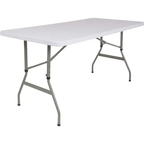 This adjustable height plastic folding table is a great option when you need a temporary dining surface or an everyday workstation in your home or office. The waterproof, impact and stain resistant top is 5 ft. long, 1.5 in. thick, and will seat up to 6 adults. Table is commercial rated for use as a training table, in banquet halls and at trade shows. Attractive gray powder coated legs lock securely in place while in use and non-marring floor caps protect your floor by sliding smoothly when you need to move the table. Designed for both indoor and outdoor use, the plastic folding table is a convenient option for your next home, school or business event.