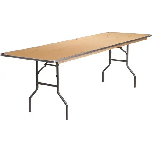 If you want a table that is sturdy, long-lasting and great at a party this heavy duty folding table is as good as it gets! This 30" x 96" Rectangular Folding Table has a .75" thick plywood top and features an extremely durable Birchwood, hardwood surface with thick aluminum metal edging. This folding table is certain to withstand the test of time. Two extra-wide bolted wood runners are fastened to the underside and designed to allow for safe table stacking. The runners are secured to the table tops with flush fitting, flat head bolts and locking nuts. The heavy duty locking wishbone legs are constructed of 1", 15 gauge tubular steel and commercial grade powder coating. This is a particularly good choice for party rental companies and other organizations that hold many events throughout the year.