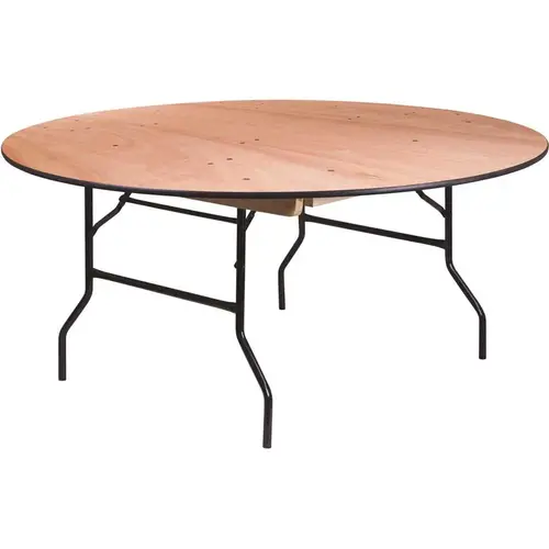 This round wood folding table is a great option for special event planners, catering companies and banquet facilities. The plywood tabletop is 5.5' in diameter, .75 in. in.thick, and will comfortably seat up to 9 adults. This durable table features a 992 pound static load capacity. A clear coated top finish and black edge band prevents table cloth snags and splinters. Attractive black powder coated wishbone legs are made from 18 gauge steel, lock securely in place while in use and fold up neatly underneath to transport and store. Protective floor caps protect your floor by sliding smoothly when you need to move it. This durable, easy-to-clean table is commercial rated for use in banquet halls, convention centers and at trade shows.