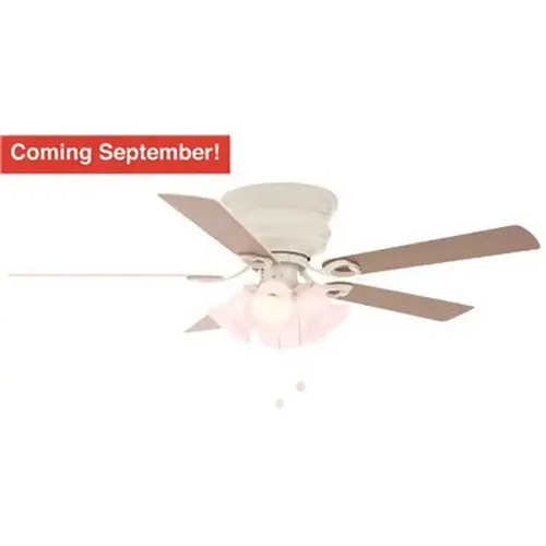 Add comfort and a stylish touch to your large room with the Clarkston 52 in. low profile ceiling fan. It has a versatile white finish, a light fixture with 4 globes and reversible blades. The motor runs at 3 speeds and can reverse direction. The light fixture takes four 40-Watt light bulbs for a total of 160-Watt of light. 5 reversible blades white and washed oak Attractive white finish White glass light kit with 4 bulbs Winter and summer reverse switch operates 3-speed motor that moves air briskly Light kit included Close to ceiling mount Indoor use, large span 160-Watt of light Specifications Airflow (CFM): 4839 Indoor/Outdoor: Indoor Blade Color Family: Oak, White Light Type: Shades Bulb Type Included: Incandescent Motor Speed (RPM): 190 Color Family: White Mounting Options: Flush Commercial/Residential: Residential Number of Blades: 5 Damp/Wet Rating: Dry Dual Fan Heads: No Pull Chain: Yes Features: Light Kit Compatible, Reversible Blades, Reversible Motor Remote Control: No Fixture Color/Finish: White Glass Style: Traditional Reverse Airflow: Yes Housing Color Family: White Reversible Two-Sided Blades: Yes Included: Cap/Plug, Hardware, Light Kit Timer: No Dimensions Assembled Depth: 52.00 in. Assembled Height: 14.50 in. Assembled Width: 52.00 in. Product Weight: 18.3 lbs. Downrod Length: Not Included Fan Blade Length: 52 in. Fan Blade Width: 52 in. Ceiling Fan Width: 52 in. CONSULT LED LAMP MANUFACTURE.