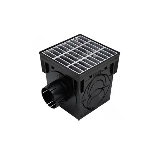 Kit includes 9 in. catch basin drain with 2 openings, 9 in. galvanized steel grate, 2 locking outlet adapters, 1 outlet plug