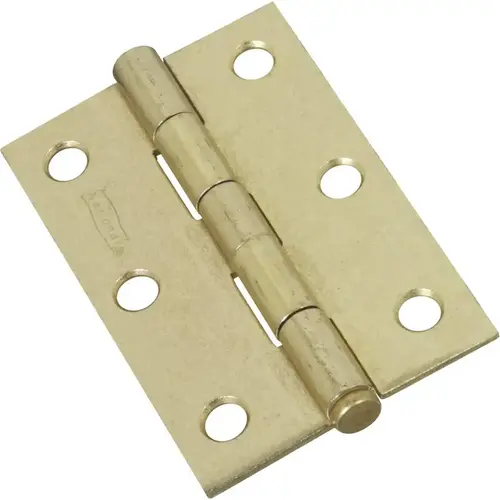 National Hardware Narrow Hinge, 28 lb Weight, Door Leaf Width: 3 in, Door Leaf Thickness: 0.065 in, Frame Leaf Width: 3 in, Frame Leaf Thickness: 0.065 in, Number of Knuckles: 5, Pin Type: Removable, Loose, Pin Diameter: 0.106 in, Full Mortise Mounting, Number of Mounting Holes: 6, Mounting Hole Diameter: 0.23 in, Hole Spacing: 1.188 in, Steel, Brass, Dimensions: 2 in L x 3 in W