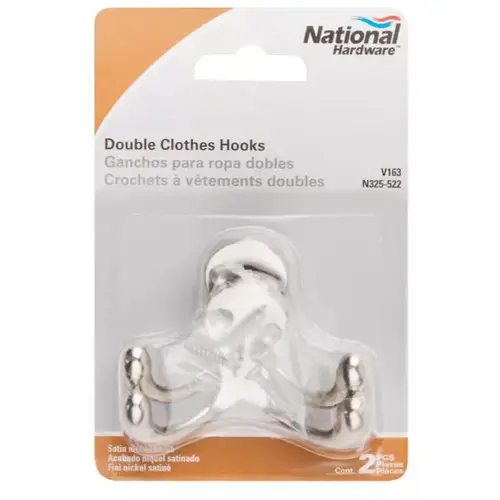 National Hardware V163 Cloth Hook, 35 lb Weight, 2 Hooks, Zinc, Satin Nickel, Wall Mounting, 0.14 in Diameter Mounting Hole, Projection: 1 in, Dimensions: 2-3/16 in H x 2-15/16 in W, Includes: (4) #6 Flat Head Screws