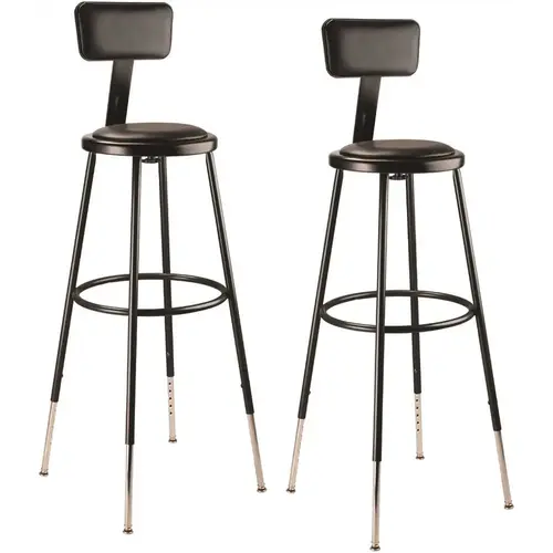 The fortified construction and soft comfort of the black 6400 Series heavy-duty padded stools with backrests are ideal for hands-on educational settings like art rooms, science labs, home economics or shop classrooms. These reliable stools feature a sturdy frame of 18-Gauge steel tubing securely welded to a 14 in. Dia seat pan. Riveted through the steel pan are. 5 in. thick black vinyl cushioning that will provide years of dependable use. Footrest ring is securely bonded to each leg with 4-spotwell contact points. Height-adjustable legs extend from 32 in. to 39 in. in 1 in. increments and adjustable padded backrests can be moved 2 in. up/down and forward/back.