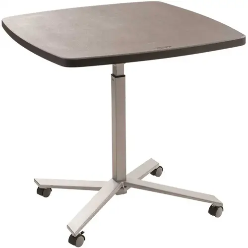 Every convenience you've ever wanted, built into a gorgeous charcoal slate colored 1-3/8" thick plastic top, mounted on a matching silver square frame. Use as a cafe table in standard 30-inch table height, or effortlessly raise to 42-inch bistro height, with a simple pull of the concealed pneumatic lever. 36"W x 36"D with contoured corner edges, they are perfect for your break room, cafeteria, or lunchroom. Lightweight, scratch resistant and durable, the attractive top will complement any decor, and the sleek contemporary legs will provide a perfect airy look. Tilting latch sets table top into vertical position for compact storage, while contemporary styled legs allow nesting with adjacent tables.