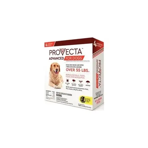 Provecta is a monthly topical treatment and prevention of ticks, fleas, mosquitos, biting fleas and lice that can cause tape worms and other serious health issues for dogs. Provecta Advanced for Dogs cannot be used on cats. For use only on dogs that are at least 7 weeks of age and older also weighing 55+- pounds.