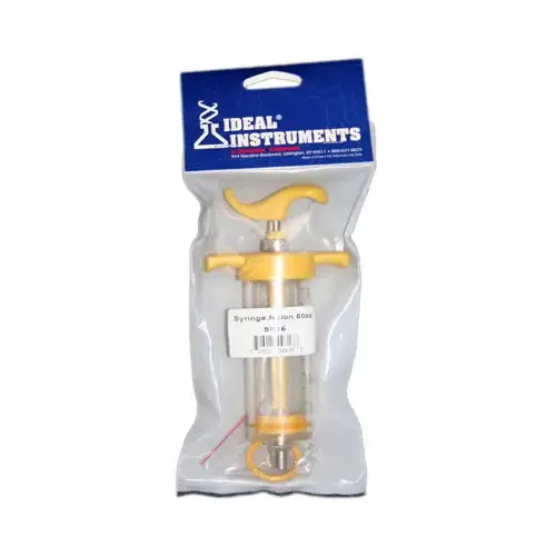 50 cc, Reusable Nylon Syringe, Has A Dosing Nut & Luer Lock Fitting, Replacement O-Ring Included, Yellow Handle.
