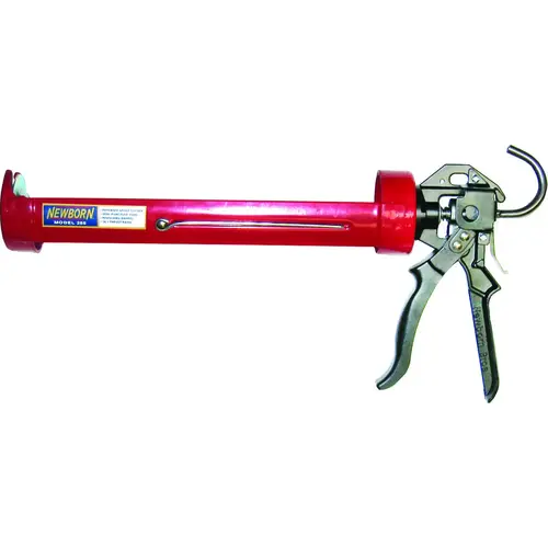 All steel welded construction. Sintered steel friction plate. Effective trigger grip for max trigger action on every stroke, eliminates hand fatigue and prolongs life of gun. Zinc alloy handle. Thumb release for ease. Thrust ratio is 18:1. Includes spout cutter, seal puncture tool and ladder hook.