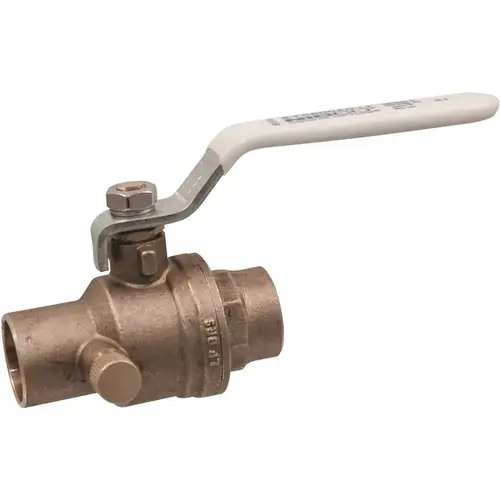 The NIBCO lead-free, brass ball valve with solder end connections includes a drain. The valve's PTFE seats and lead-free ball exhibit high corrosion resistance properties. The valve is ideal for hot/cold water applications.