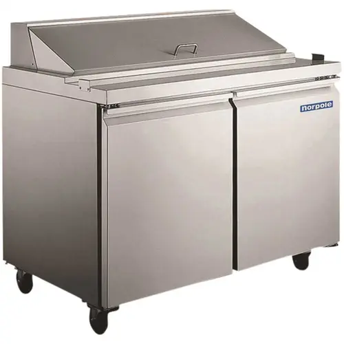 Norpole's 9.5 cu. ft. 2 Door Sandwich-Salad Prep Table is manufactured to ensure optimal performance and design, while providing convenient food storage and plenty of preparation space. The unit is constructed of high quality stainless steel on both the exterior and interior and is designed for easy service and maintenance. Digital temperature controls work to maintain the optimum interior temperature. Self-closing doors help to reduce wasted energy and their 90 degree stay open feature provides easy access when loading and unloading. Auto cycle defrost helps to provide lower energy consumption and colder product temperature The 2 shelves are removable and adjustable for easy cleaning and custom configurations. Included are 12 pans as well as a cutting board for easy food preparation and there is a compartment barrier that prevents spillage into the food storage area. The heavy-duty compressor is bottom mounted for easy cleaning and maintenance.