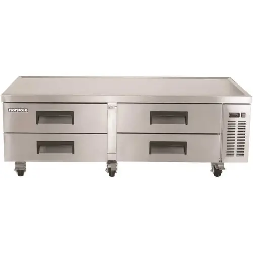 The Norpole 72 in. wide, 16 cu. ft. capacity refrigerated chef base maximizes efficiency by providing cold foods right where they are needed. It is a space and productivity solution for your commercial kitchen. Store your cold foods right under your countertop cooking equipment. The 4-drawers can accommodate 8-1/1 in. food pans. It is mounted on heavy duty caster wheels for easy mobility.
