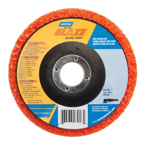 Complete stripping and removal of parting lines, rust and stock when you attach this Bear-Tex® Blaze® Rapid Strip AO coarse grit non-woven depressed center disc to your right angle grinder. This extra coarse grit disc is ideal for work on aluminum, cast iron, fiberglass and masonry, and it doesn't shed or snag when you're working on rusty pieces. Its Rapid Strip material provides aggressive performance over an extended period, and the ceramic grain is twice as fast and consistent as silicon carbide discs.