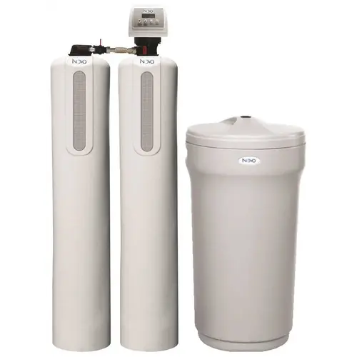 Features. Dedicated softening and carbon filtration tanks provide truly refined water. NSF Certified control valve with electronic sensors, adjustable cycles and proven piston, seal and spacer design. Reverse Flow regeneration preserves unused portion of softening bed from unnecessary exchange saving salt. Precision brining calculates the exact amount of brine required to regenerate saving up to 30% more salt. Backwash Frequency Preset for clean municipal water saves water by matching backwash to water quality need. Soft Water brine tank refill keeps tank and injectors clean. Automatic system refresh flushes stagnant water. NSF Certified fiberglass pressure tank. WQA Gold Seal Certified cation resin. User-friendly backlit LCD display. No Touch rotating information display. Unique bypass with integrated turbine meter saves space, eliminates connections. Time saving quick connect fittings on bypass, drain line, brine line and power cord. Drain line O-ring. No need for Teflon. Brine safety valve provides added overflow protection. 48 hour self-charging battery back-up. Includes hose clamp and 10 ft. of drain tubing. Also has KDF for the treatment of organic matter Specifications. Salt Used - Per Regeneration: 9.0 lbs. Water sed - Regeneration: 148 Gal. Hardness Removal - Grains: 37,500. Tank #1 Carbon Quantity - Cubic Feet: 1.5 ft. Tank #2 Resin Quantity - Cubic Feet: 1.5 ft. Tank Size: 10 in. x 54 in. Tank Jacket / Media Loaded: Yes.