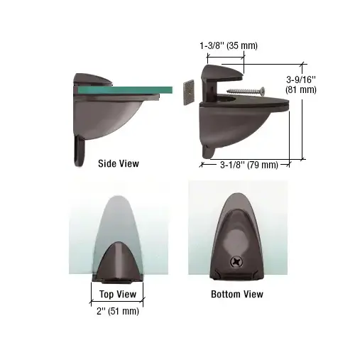 CRL Heavy-Duty Adjustable Shelf Clamps work with 1/2" to 15/16" (12 to 24 mm) thick glass or wood shelves up to 12" (305 mm) deep. The Clamps are secured with one screw (included) to the substrate. An adjustment screw is also included to accommodate various shelf glass thicknesses.