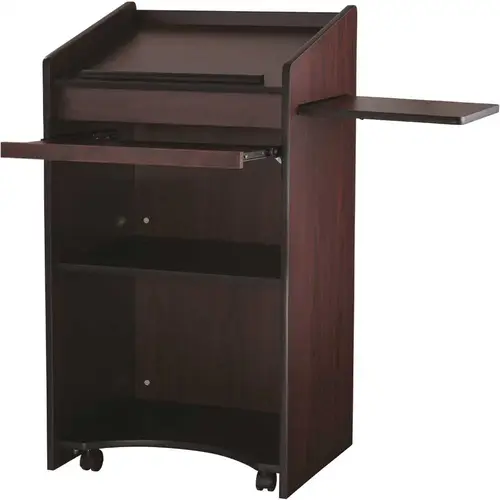The Model #600 Aristocrat is a bold, executive-style lectern ideal for conference, training, and formal meeting rooms. The high-quality cabinetry is of wood grain thermofused laminate, accented with attractive T-mold edging and features four concealed easy-roll casters (two locking) for smooth mobility. A side-mounted 16" x 15" slide-out shelf (35-lb. weight capacity) is at the presenter's right side for A/V equipment or other presentation needs. The Aristocrat's two built-in 23.5" x 18" shelves provide ample storage space. Ships ready for easy assembly.