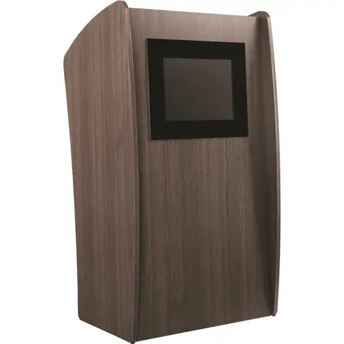The 612 Vision Lectern comes with a built-in digital 15" LCD screen for projecting JPEG slideshows, MPEG film footage or to centrally display an organization's logo or icon. The on-screen menu is available in seven language options. The 612 comes complete with a user-friendly remote control and an AC power cord. Ships ready for easy assembly. Featured in Ribbonwood laminate.