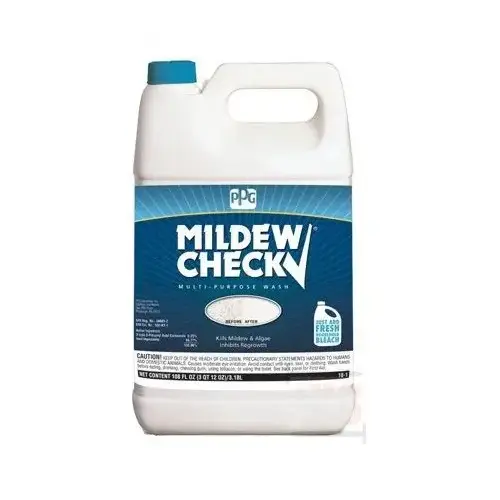 The primary use of PPG MILDEW CHECK multi-purpose wash is to clean exterior painted surfaces containing mold, mildew, algae and surface dirt (not imbedded dirt). It is recommended for painted or stained wood siding, aluminum siding, wood fences, decks, stucco, roofing, brick or cement block, concrete walkways or walls and ceramic tile and grout. Proper application of this product will leave a protective shield that inhibits regrowth of mildew and algae. This protection remains on the surface after rinsing and is water insoluble. Films with an acceptable appearance may not allow immediate repainting, however, repainting after 24 to 48 hrs is possible.