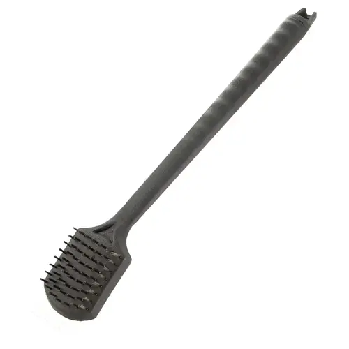 This Omaha grill brush has stainless steel bristles and a stainless steel scraper removes char and stuck on debris from grills.