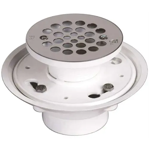 Bolt Down Shower Drain with Gasket 2 in. with adjustable strainer, Gasketed (no caulk) for tile showers. Fits 2 in. IPS, C.I., PVC, ABS or steel (or inside 4 in. PVC pipe). Furnished with snap-in stainless steel grate - will accommodate a screw-type grate. Finished with screw-on stainless steel strainer.