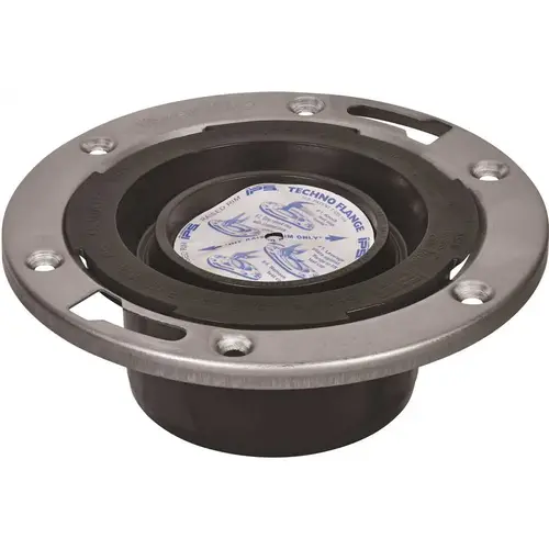 DWV Abs Closet Flange 3 in. x 4 in. Adjustable stainless steel ring, 1 piece knockout will not fall down drain line. Molded-in test cap prevents damage during construction, Fits over 3 in. or inside 4 in. Sch. 40 DWV pipe.