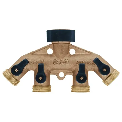Standard 3/4 in swivel x MHT connection for 1 to 4 sprinkler hose faucet valves or multiple hose connections. Includes mounting bracket, for stability and 4 shut-off valves.