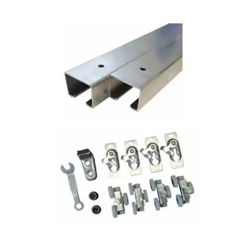 2 Tracks; 4 each 3-wheel ball bearing hangers and plates; 2 stops; Floor guide; 2 each 2-1/8" zinc pulls; Wrench; Screws & Fasteners